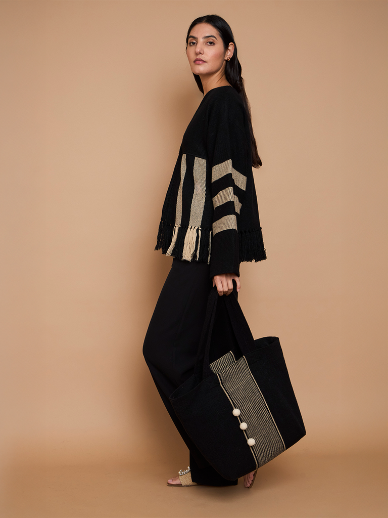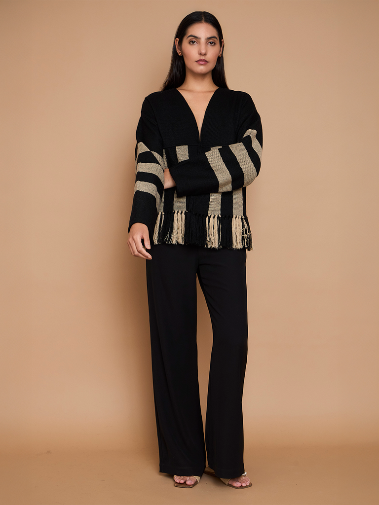 Un diseño que evoca la veta de un mineral, donde el beige natural se encuentra con el negro profundo. Esta chaqueta, tejida en la simpleza de un telar de dos lisos, es una pieza de contraste y elegancia. Sus flecos le dan un toque final de movimiento y autenticidad artesanal. Una prenda versátil que ilumina y abriga.