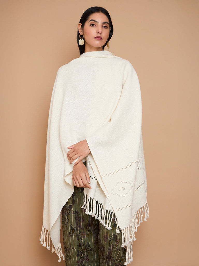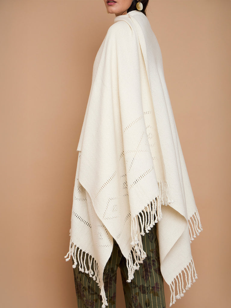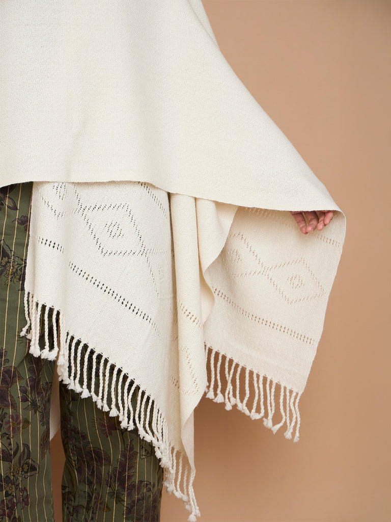 Elegancia en movimiento. La Ruana Calada envuelve la silueta con la sofisticación de sus detalles de encaje y la fluidez de la lana de alpaca. En un delicado tono plomo perla, es una prenda abierta y versátil que eleva cualquier conjunto, aportando calidez y un toque de arte textil a tu estilo.